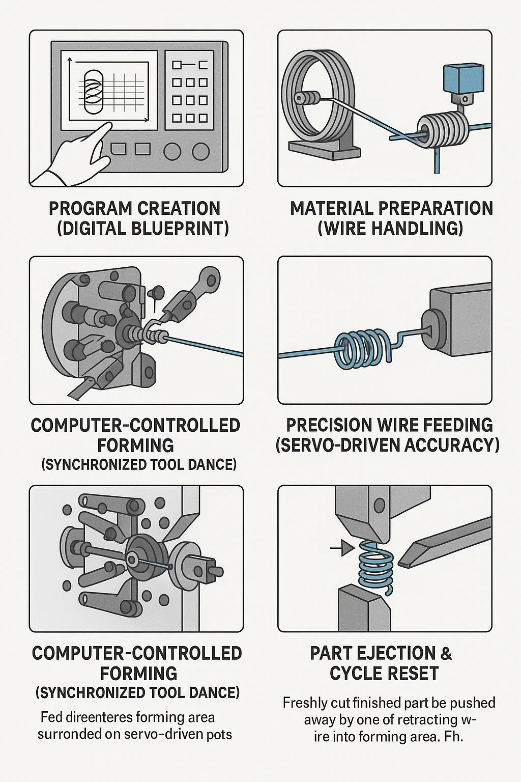 Así es como un Máquina de resorte CNC opera, desglosado en su funcional esencial desglosado en sus pasos funcionales esenciales: