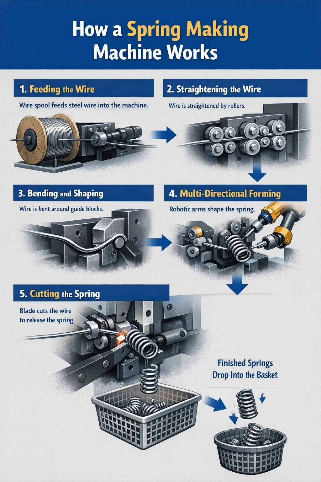 Podemos dividir el proceso de trabajo de una máquina para fabricar resortes en varios pasos: