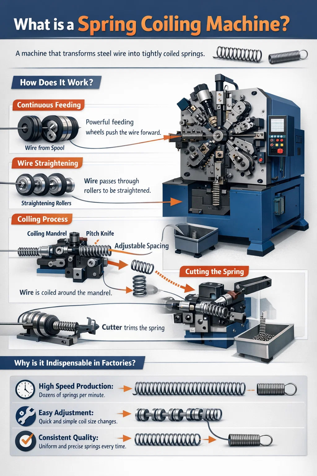 Si alguna vez ha visto los resortes de compresión de un bolígrafo, o esos resortes de tensión largos, en su mayoría están fabricados con este tipo de máquinas. Su tarea principal es transformar un trozo recto de alambre de acero en una serie de bobinas, como un tobogán en espiral. En comparación con máquinas multifuncionales más complejas, la máquina enrolladora de resortes se centra en la habilidad principal de "enrollar", lo que la hace altamente eficiente.