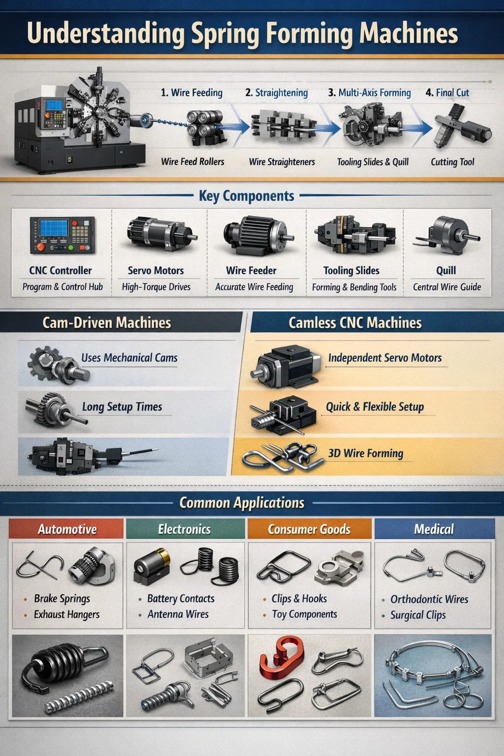A spring forming machine is a specialized CNC (Computer Numerical Control) industrial device designed to bend, coil, and shape metal wire into complex 2D or 3D geometries. Unlike basic coiling machines that primarily produce standard cylindrical springs, a spring forming machine utilizes multiple independent axes —often ranging from 3 to 12 or more—to create intricate wire forms, torsion springs, and battery contacts with extreme precision.