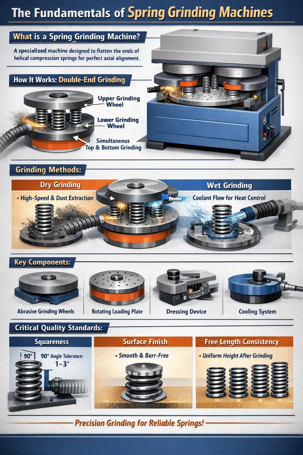 El rectificado en seco es el método más común para los resortes de acero al carbono estándar. Se basa en un alto volumen sistema de extracción de polvo para eliminar virutas de metal y partículas abrasivas. Si bien es eficaz para la producción a alta velocidad, el rectificado en seco puede provocar una acumulación excesiva de calor si la velocidad de alimentación es demasiado agresiva, lo que podría alterar el templado del resorte.