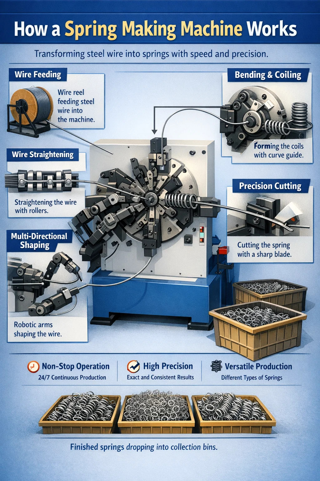 La máquina suele tener un carrete de alambre en la parte posterior que sostiene una gran bobina de alambre de acero. Los rodillos de alimentación internos sujetan firmemente el alambre y lo introducen de manera constante y precisa en el núcleo de la máquina. La cantidad de alambre alimentado determina la longitud del resorte.