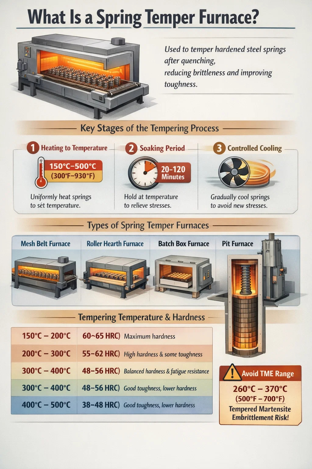 Un horno de templado de resortes es un tipo de horno de tratamiento térmico industrial diseñado específicamente para templar resortes de acero después del endurecimiento. Su trabajo principal es recalentar acero para resortes endurecido a una temperatura controlada, generalmente entre 150°C y 500°C (300°F a 930°F) — manténgalo allí durante un período definido y luego déjelo enfriar de manera controlada. Este proceso alivia las tensiones internas introducidas durante el enfriamiento y el endurecimiento, ajusta la dureza a un rango específico y restaura un grado de tenacidad y elasticidad que de otro modo estaría ausente en un resorte completamente endurecido.