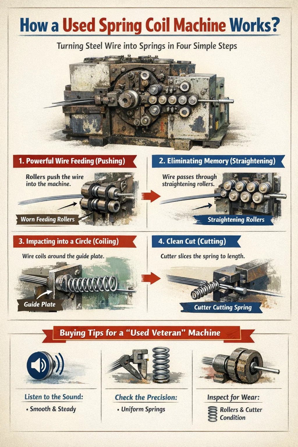 unt the back of the machine are several rollers that tightly grip the steel wire. They act like a pair of strong hands, continuously pushing bundles of steel wire into the machine. For used spring coil machines, the wear and tear of these rollers is a major concern, as the stability of the wire feeding directly affects the accuracy of the springs.
