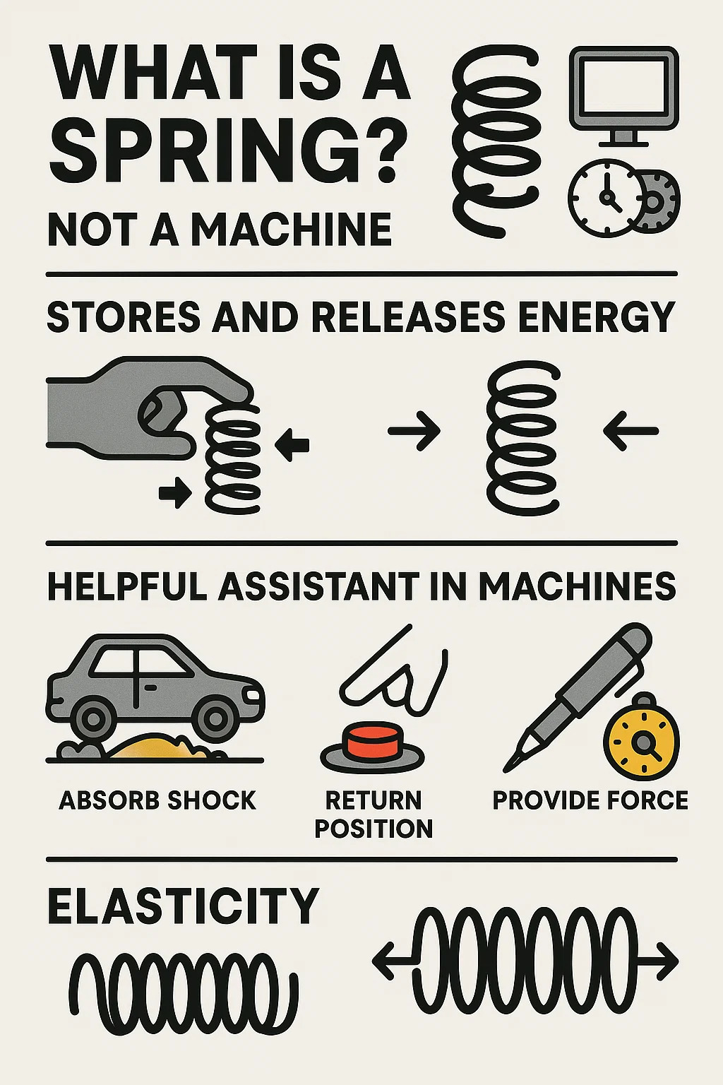 Aunque un resorte en sí no es una máquina, es un "pequeño ayudante" crucial en máquinas, herramientas y equipos porque puede: