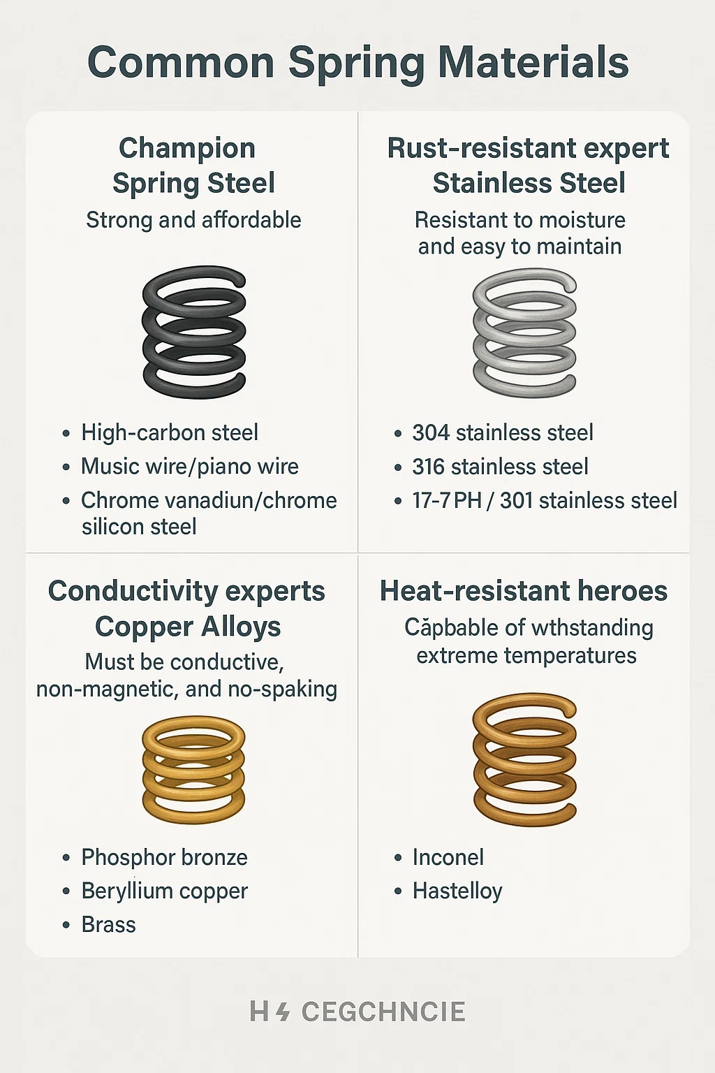 La elección del metal adecuado para los resortes depende de los requisitos de la aplicación: ¿cuánta fuerza resistirá? ¿Se oxidará? ¿Hará calor en el ambiente de trabajo? ¿Necesita conducir electricidad? Estas son las características de los materiales de uso común: